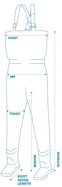 To give you an indication of your size, follow the measurements shown in the tables, using the 6 measuring points being Chest, Hip, Thigh, Inseam, Outseam and Sock inside length. This will give you a fairly good idea about the size you need, but trying the waders at your local retailer is always recommended.